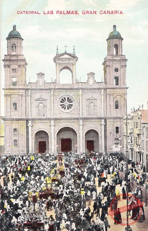 Las Palmas, Cathedral, Gran Canaria, crowd gathering, antique postcard